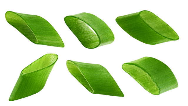 Falling green onion slices, cut chives isolated on transparent or white background