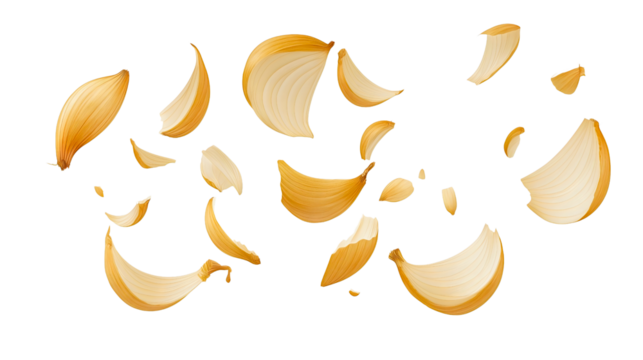 Flying sliced onion rings collection isolated, fresh cut vegetable ingredients levitating, organic cooking pieces in motion set