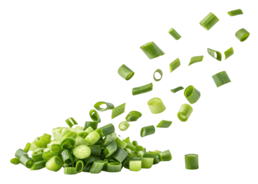 Fresh spring onion slices appear to float and scatter beautifully in air creating vibrant and fresh visual effect