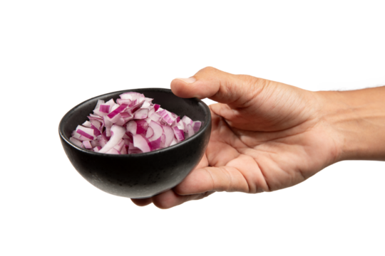 Male hand holding a black bowl with purple onion cuts isolated no background