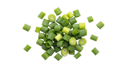 Pile of chopped green onions isolated on transparent background. Pile of freshly chopped green onions stalks isolated on white background.