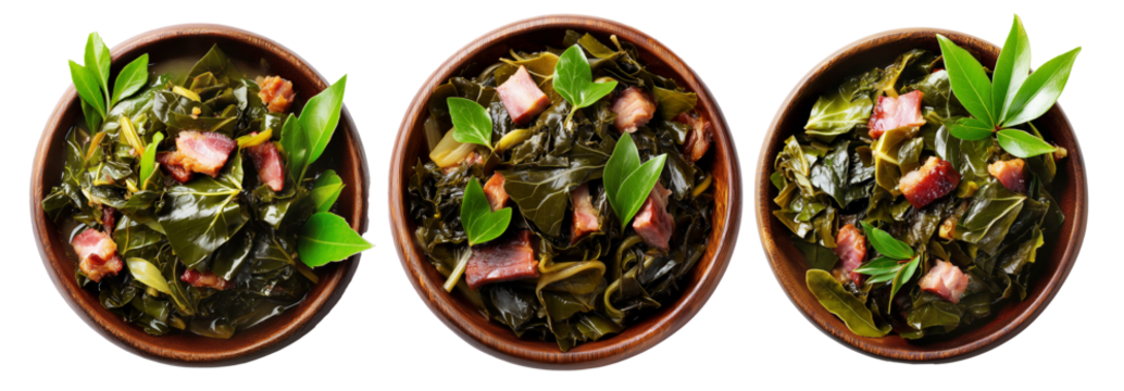 Cooked collard greens slow-cooked with crispy bacon slices served in wooden bowl, isolated on white transparent background