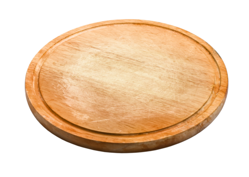 Round wooden chopping board rotating on transparent background