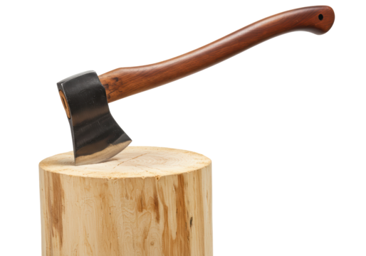 Isolated axe stuck in wooden stump for chopping wood outside, lumberjack gear, tools