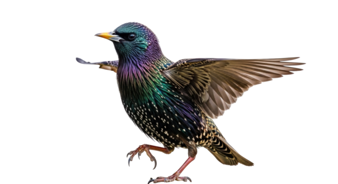 Isolated European Starling taking flight, beautiful colorful feathers, landing gracefully