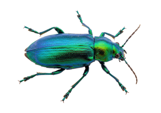 Isolated Beetle featuring iridescent blue green coloration showing its many legs and antennae