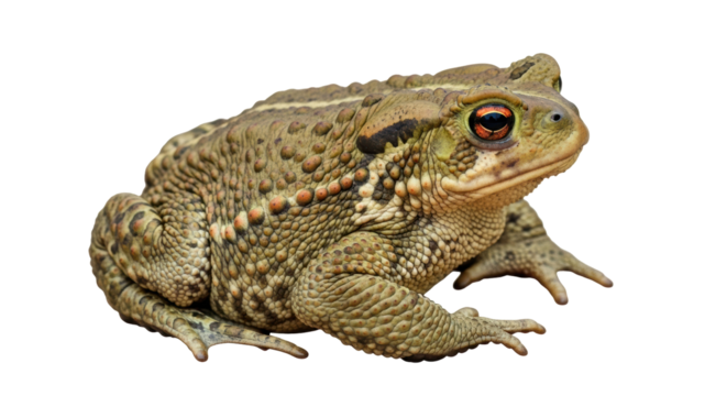 Large brown toad isolated PNG on transparent background, amphibian with bumpy skin and orange eyes for wildlife and nature designs