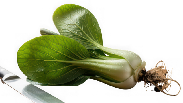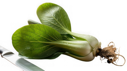 Photo of fresh bok choy with roots on a knife isolated on transparent background