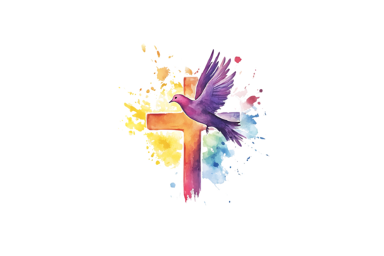 Rainbow Cross with Dove and Watercolor Splash