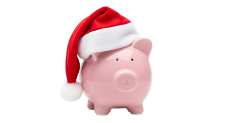 Festive pink piggy bank wearing a santa hat ready for holiday savings and christmas financial planning isolated on transparent background