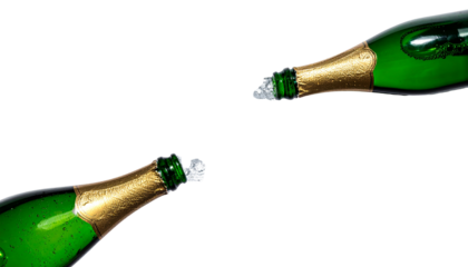 Champagne bottle with golden foil popping open and sparkling stream flying, luxury toast icon, transparent background