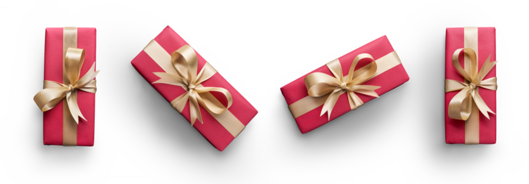 Top view of Christmas presents wrapped in red paper with gold ribbon and bow decoration isolated against a transparent background.