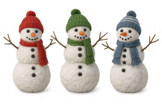 Three snowmen standing in a row, wearing colorful knit hats and scarves, ready for christmas and winter season celebrations