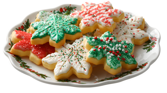 Colorful holiday cookies arranged on a platter, cut out transparent