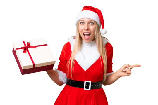 Young blonde woman with christmas hat and holding a gift over isolated chroma key background surprised and pointing finger to the side