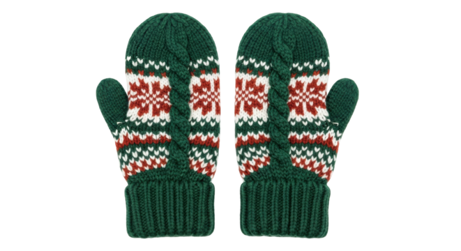 Isolated pair of warm knitted mittens with pattern, hand-made winter wear, green, red, cream