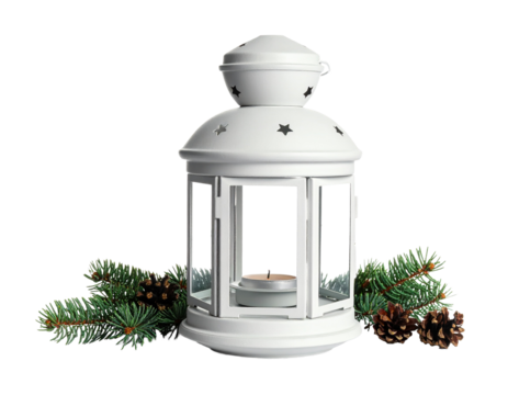 christmas pine tree branches and white lantern with candle isolated on transparent background