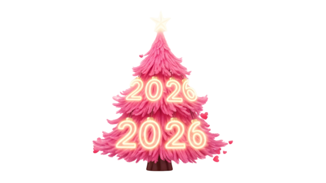 Vibrant pink Christmas tree with glowing neon 2026 text for New Year celebration marketing. isolated PNG with Transparent Background