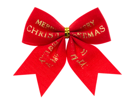Close-up of a vibrant red satin bow with gold lettering saying "Merry Christmas