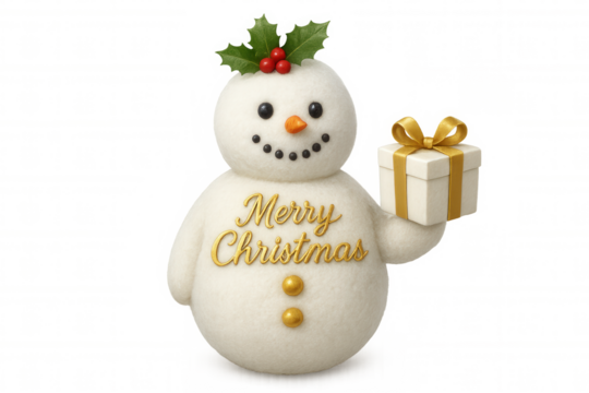 Snowman holding christmas gift, saying merry christmas with holly and berries, transparent background