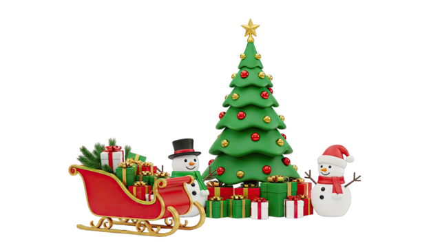 Christmas Scene with Snowmen, Sleigh, and Decorated Tree