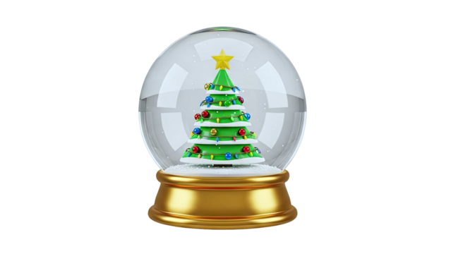 Frosted glass snow globe with christmas trees, snowflakes, gold base, transparent background, copy space, soft studio light, christmas holiday magic concept.