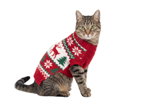 Tabby cat in Christmas sweater isolated PNG, festive pet wearing holiday apparel on transparent background for seasonal designs