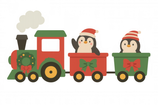 Cute christmas train with penguins in santa hats, festive holiday decoration design on transparent background