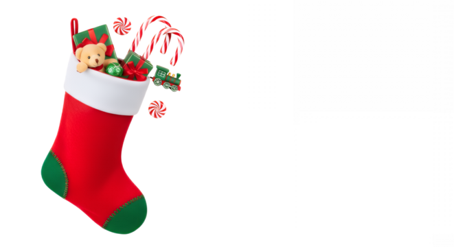 Festive christmas stocking overflowing with gifts and candy canes on transparent background