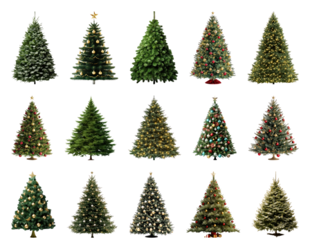 PNG Variety of decorated Christmas trees, element set on transparent background