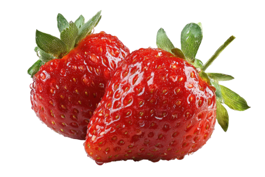 Two bright red, plump strawberries with green leaves