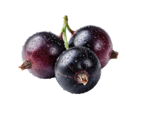 Close-up of three dark purple black currants.  Each berry is plump and glistening with water droplets.  Stem and leaves are visible