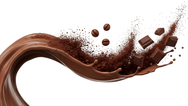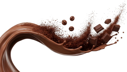 Chocolate and Coffee Splash with Cocoa Powder. Liquid Mocha Wave with Beans and Chocolate Chunks.
