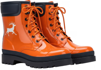 Bright orange lace up boots with deer graphic isolated on transparent background