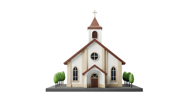 Classic white wooden church with a tall steeple and red door, isolated on transparent background