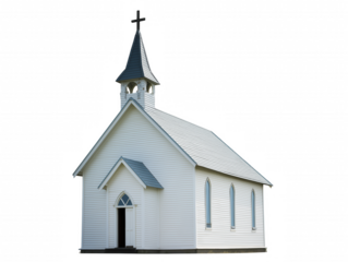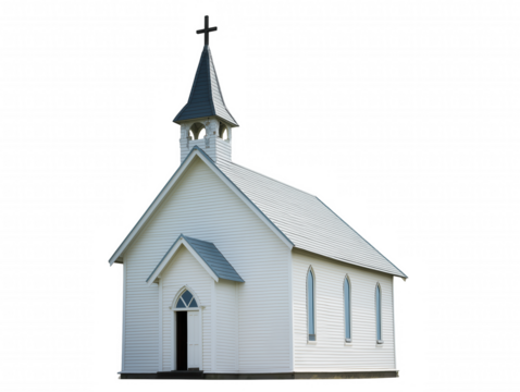 Isometric illustration of a small symmetrical church with white exterior and dark gray roof on transparent background