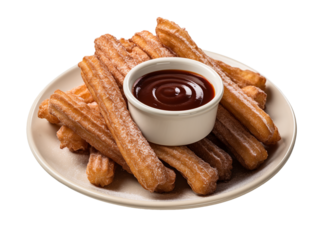 Churros with Sauce Chocolate on Plate, Isolated on Transparent Background, Top View