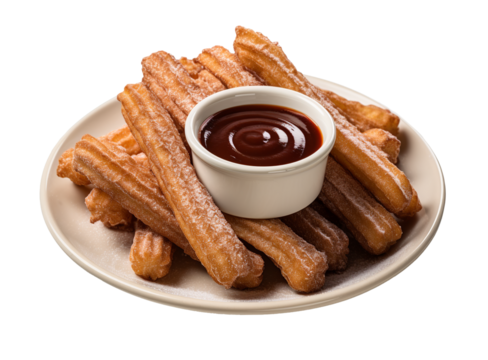 Churros dessert, with chocolate dipping sauce, isolated on white or transparent background.