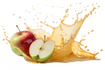 Juicy red and green apples with a dynamic splash of apple juice, creating a fresh and vibrant composition, isolated on white background