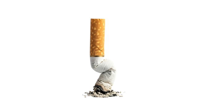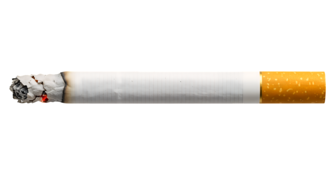 Burning cigarette showing glowing ember and ash on transparent background, symbolizing addiction and health risk