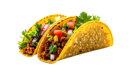 Three hard-shell tacos brimming with fillings, cilantro garnish, isolated on black