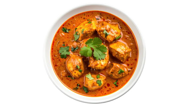 Three bowls of creamy paneer butter masala with fresh cilantro garnish isolated on a transparent background