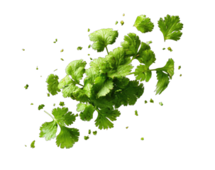 Fresh cilantro sprig on white background. Delicate green herb leaves used in cooking for flavor and garnish