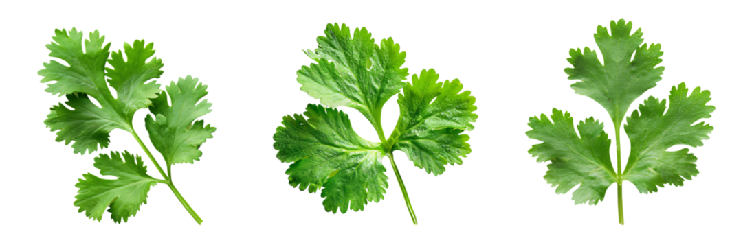 Fresh cilantro leaves in various shapes isolated on transparent background