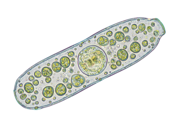 Microscopic view of a green algae chain with detailed cellular structures.