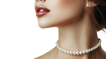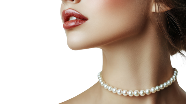 Portrait of a woman showcasing elegance with a pearl necklace, emphasizing beauty and sophistication.