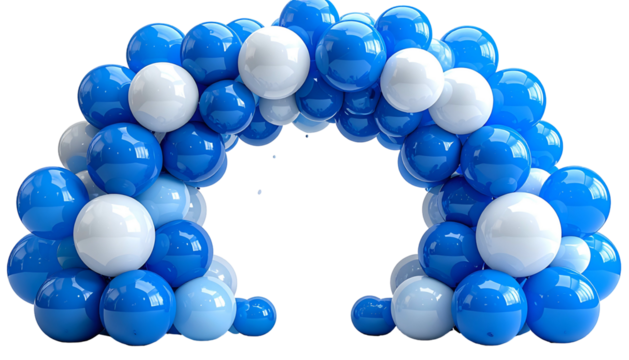A vibrant archway constructed from blue and white balloons, creating a cheerful entrance