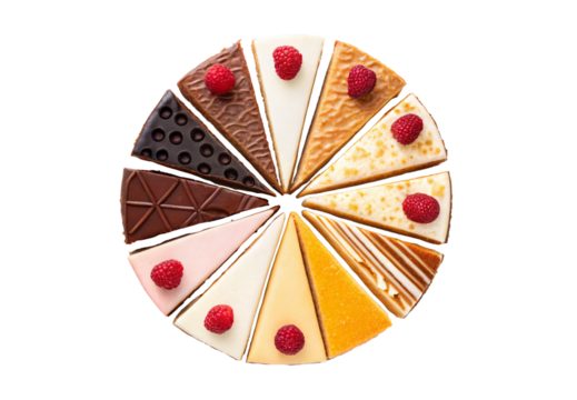 Variety of cheesecake wedges displayed in wheel formation with raspberries and chocolate, isolated on a transparent background
