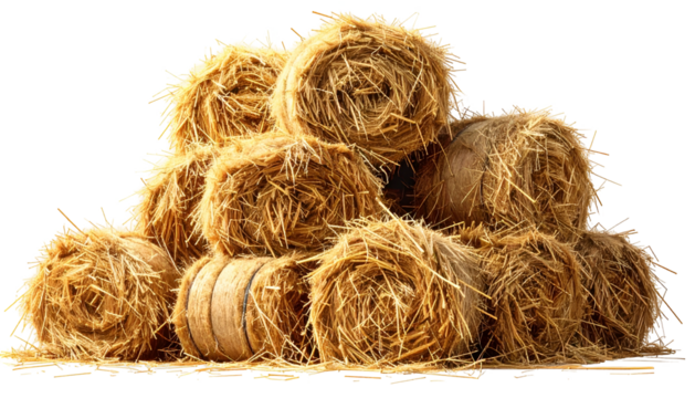 A pile of round bales of hay, golden in color, stacked atop one another