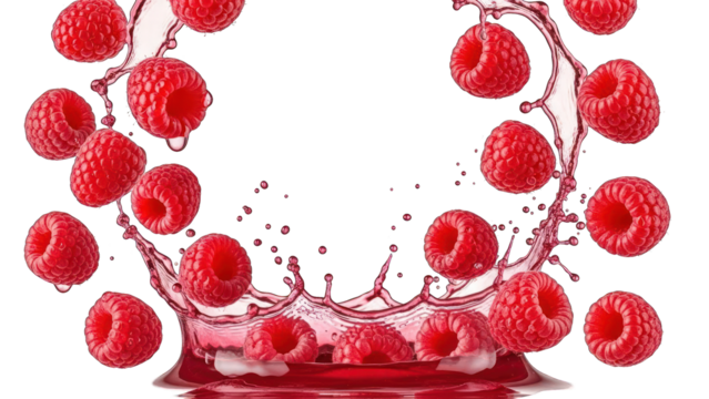 Burst of ripe raspberries erupting from a splash of vibrant, ruby-red liquid against black